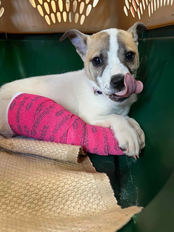 This cute little pup was taken into the shelter as a stray. She suffered from a severely broke leg that required pins and a plate to avoid amputation.