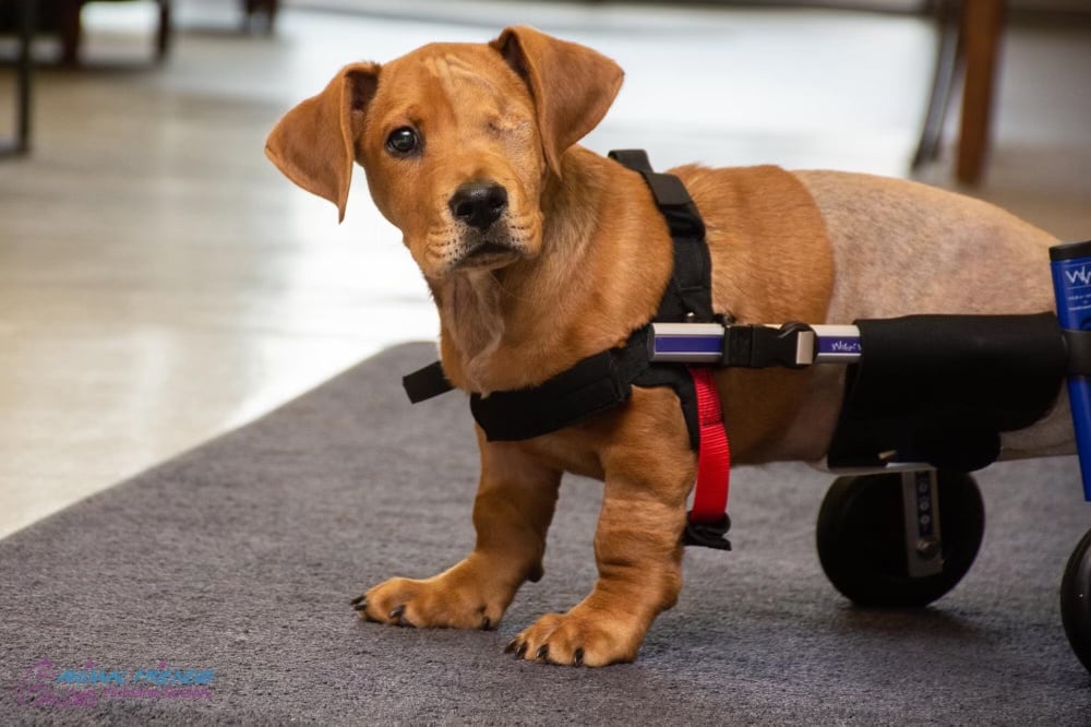 Hi! My name is Trooper! At 8 weeks old I was abandoned in a local park along with my brother. We wandered onto a nearby train track where I was struck by an oncoming train. I lost both of my back legs, most of my tail, and one of my eyes. Fortunately, I was adopted days after my recovery by an amazing family. To my delight and theirs, when I arrived hime I was greeted by other fur-buds who had unique needs like myself.